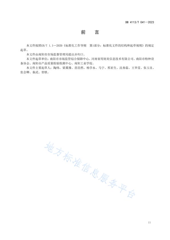 本文件按照GB/T 1. 1-2020《标准化工作导则第 1部分:标准化文件的结构和起草规则》的规定起草。 本文件由南阳市市场监督管理局提出并归口。 本文件起草单位:南阳市市场监管综合保障中心、河南省用则美信息技术有限公司、南阳市特种设备协会、南阳市产品质量检验检测中心、南阳工业学校。 本文件主要起草人:陶炜、梁冀豫、苗浩然、杨学永、马宁、邢亚生、沈春磊、王华雯、张玉良、张会卿、秦武、曾轶。