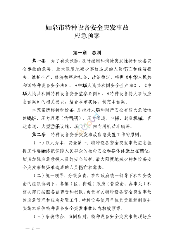 • 适用范围:如皋市行政区域内的一般特种设备事故(特别重大、重大、较大事故需上报南通市启动更高层级预案)。