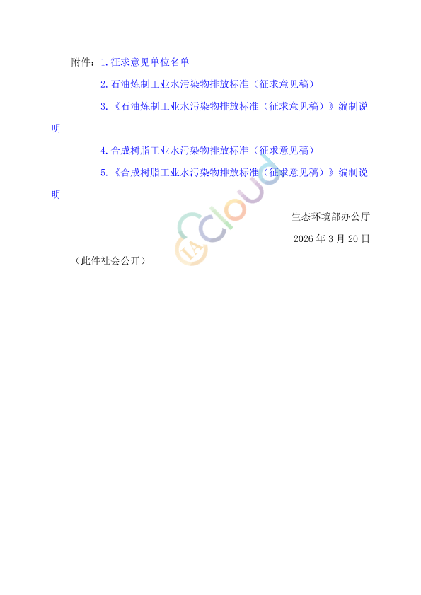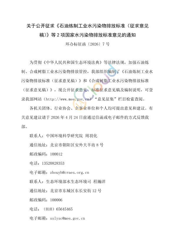 为贯彻《中华人民共和国生态环境法典》等法律法规,加强石油炼制、合成树脂工业水污染物排放管控,我部组织编制了《石油炼制工业水污染物排放标准(征求意见稿)》和《合成树脂工业水污染物排放标准(征求意见稿)》,现公开征求意见。标准征求意见稿及编制说明,可登录我部网站(http://www.mee.gov.cn)“意见征集”栏目检索查阅。 各机关团体、行业协会、企事业单位和个人均可提出意见和建议。有关意见建议请于2026年4月24日前通过信函或电子邮件的方式反馈我部。