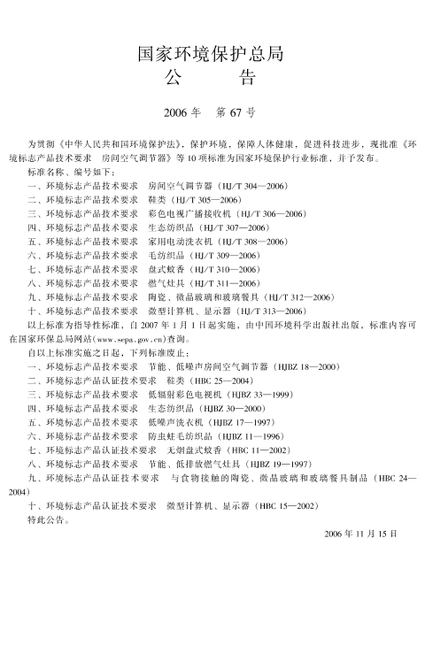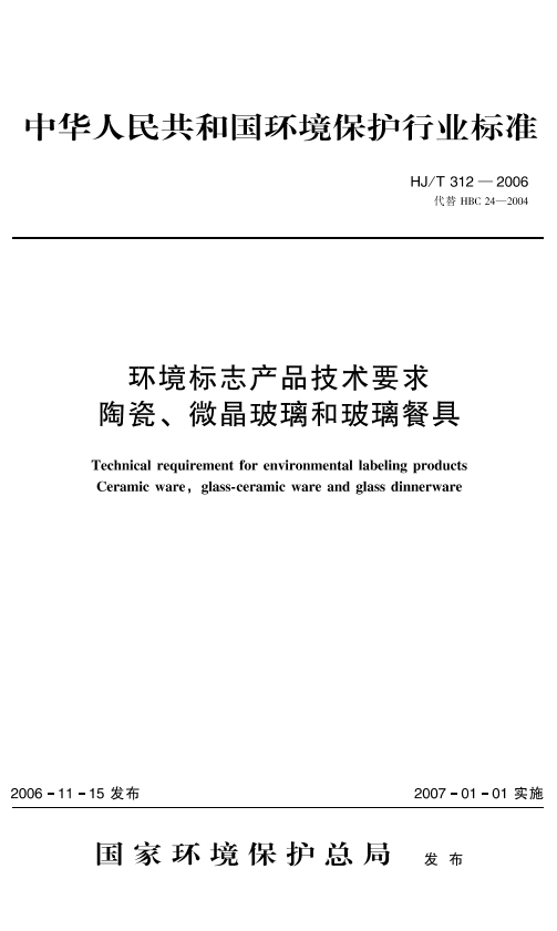 为贯彻 《中华人民共和国环境保护法》,减少陶瓷、微晶玻璃和玻璃餐具在生产和使用过程中对 人体健康和环境的影响,制定本标准。 本标准对 《环境标志产品认证技术要求 与食物接触的陶瓷、微晶玻璃和玻璃餐具制品》( HBC 24—2004)进行了全面修改。 本标准为指导性标准,适用于中国环境标志产品认证。 本标准由国家环境保护总局科技标准司提出。 本标准主要起草单位:国家环境保护总局环境发展中心。 本标准国家环境保护总局2006年11月15日批准。 本标准自2007年1月1日起实施,自实施之日起代替HBC24—2004。 本标准由国家环境保护总局解释。 本标准所代替标准的历次版本发布情况为: ———HBC24—2004。