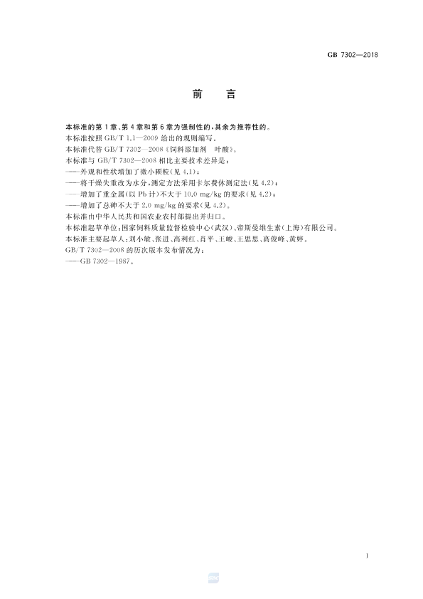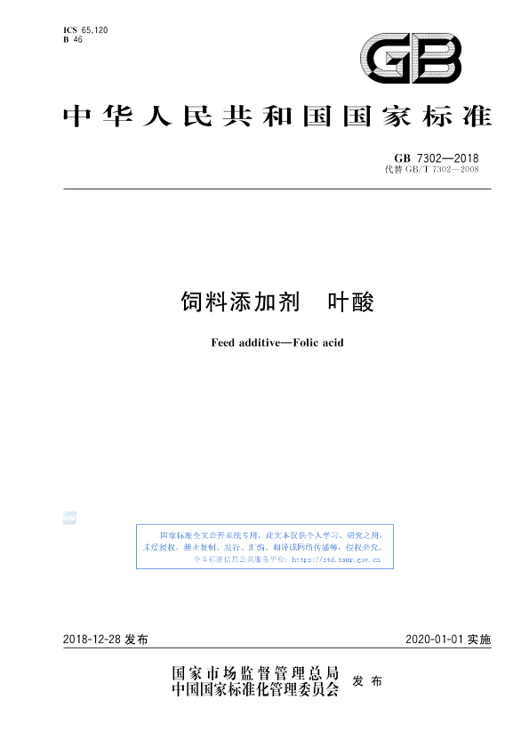 《饲料添加剂 叶酸》是中国国家标准(GB/T 7302•2018),于2018年12月28日发布,并于2020年1月1日实施,取代了之前的GB/T 7302•2008版本。该标准规定了饲料添加剂叶酸的要求、试验方法、检验规则以及标签、包装、运输和贮存等方面的内容。以下是对文本内容的详细分析: