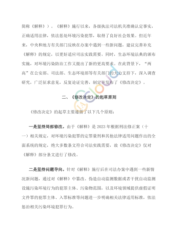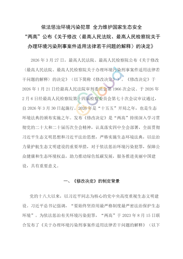 2026年3月27日,最高人民法院、最高人民检察院正式发布《最高人民法院、最高人民检察院关于修改〈最高人民法院、最高人民检察院关于办理环境污染刑事案件适用法律若干问题的解释〉的决定》(以下简称《修改决定》)。《修改决定》于2026年1月21日经最高人民法院审判委员会第1966次会议、于2026年2月6日经最高人民检察院第十四届检察委员会第七十次会议审议通过,自2026年3月30日起施行。2026年是“十五五”开局之年,也是生态环境法典的颁布实施之年。发布《修改决定》是最高人民法院、最高人民检察院持续深入学习贯彻党的二十大和二十届历次全会精神,认真落实四中全会部署,全面贯彻习近平生态文明思想和习近平法治思想,严格实施生态环境法典,以法治力量护航生态文明建设的重要举措,对于依法惩治环境污染犯罪,保障公众健康和生态环境权益,助力推动绿色低碳发展,服务推进美丽中国建设,具有重要现实意义。