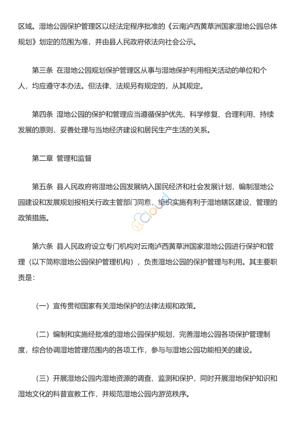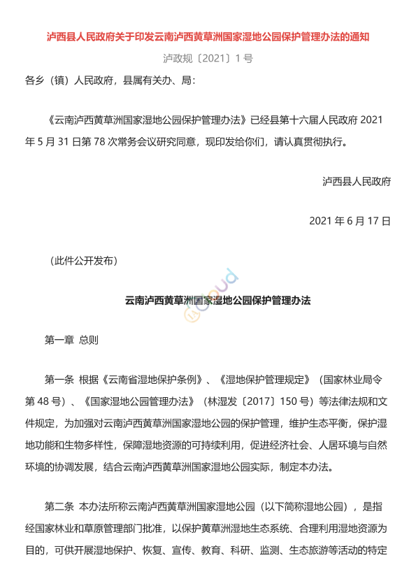 各乡(镇)人民政府,县属有关办、局: 《云南泸西黄草洲国家湿地公园保护管理办法》已经县第十六届人民政府2021年5月31日第78次常务会议研究同意,现印发给你们,请认真贯彻执行。 泸西县人民政府 2021年6月17日