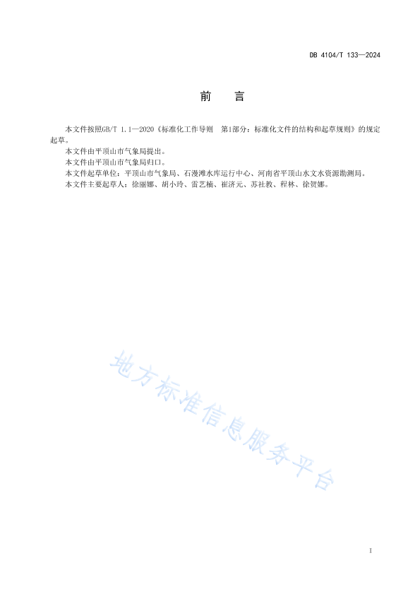 本文件按照GB/T 1.1—2020《标准化工作导则 第1部分:标准化文件的结构和起草规则》的规定起草。 本文件由平顶山市气象局提出。 本文件由平顶山市气象局归口。 本文件起草单位:平顶山市气象局、石漫滩水库运行中心、河南省平顶山水文水资源勘测局。 本文件主要起草人:徐丽娜、胡小玲、雷艺楠、崔济元、苏社教、程林、徐贺娜。