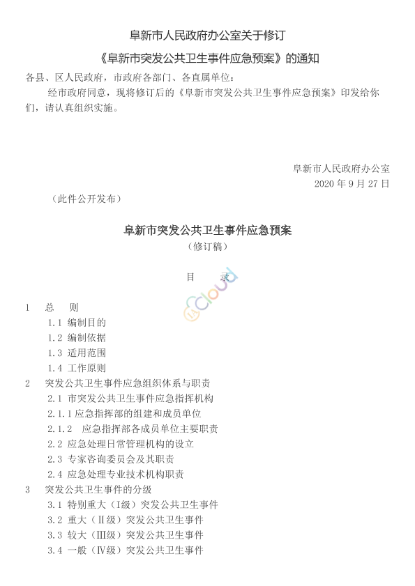 各县、区人民政府,市政府各部门、各直属单位: 经市政府同意,现将修订后的《阜新市突发公共卫生事件应急预案》印发给你们,请认真组织实施。 阜新市人民政府办公室 2020年9月27日