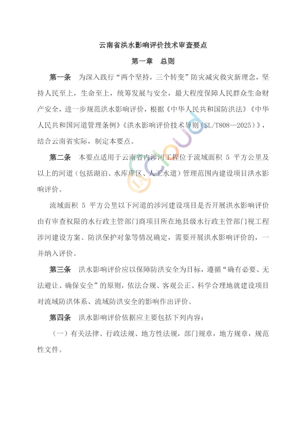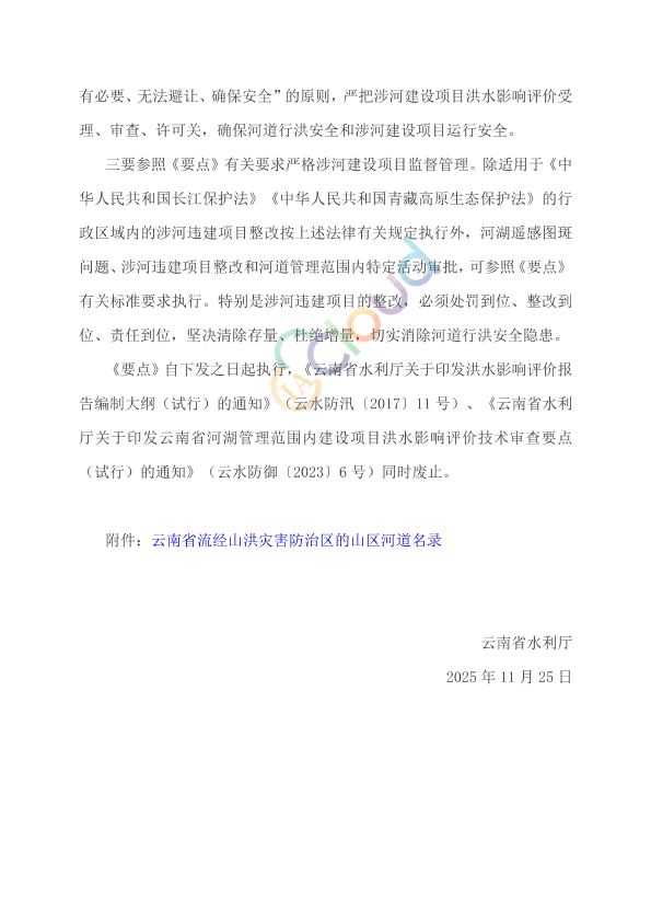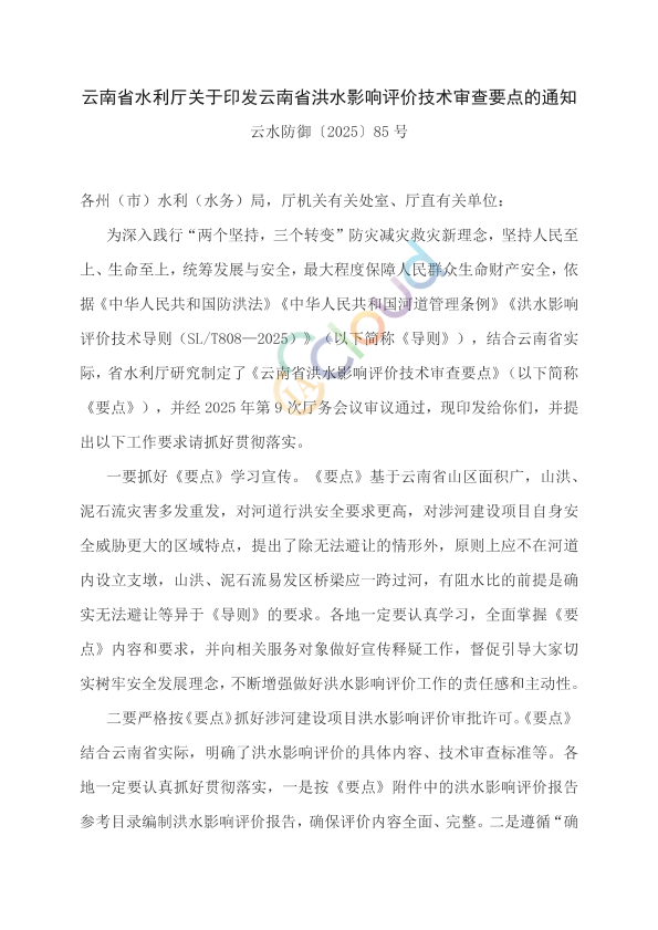 各州(市)水利(水务)局,厅机关有关处室、厅直有关单位: 为深入践行“两个坚持,三个转变”防灾减灾救灾新理念,坚持人民至上、生命至上,统筹发展与安全,最大程度保障人民群众生命财产安全,依据《中华人民共和国防洪法》《中华人民共和国河道管理条例》《洪水影响评价技术导则(SL/T808—2025)》(以下简称《导则》),结合云南省实际,省水利厅研究制定了《云南省洪水影响评价技术审查要点》(以下简称《要点》),并经2025年第9次厅务会议审议通过,现印发给你们,并提出以下工作要求请抓好贯彻落实。