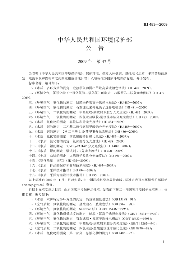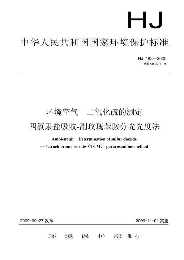 为贯彻《中华人民共和国环境保护法》和《中华人民共和国大气污染防治法》,保护环境,保障人体健康,规范环境空气中二氧化硫的测定方法,制定本标准。 本标准规定了测定环境空气中二氧化硫的四氯汞盐吸收-副玫瑰苯胺分光光度法。 本标准是对《空气质量 二氧化硫的测定 四氯汞盐-盐酸副玫瑰苯胺比色法》(GB/T 8970—88)的修订。 本标准首次发布于 1988 年,原标准起草单位为北京市环境保护监测中心。本次为第一次修订。 主要修订内容如下: ——将标准的名称改为《环境空气 二氧化硫的测定 四氯汞盐吸收-副玫瑰苯胺分光光度法》; ——增加了警告的内容; ——明确了标准的检出限和测定范围; ——增加了标准溶液标定时平行滴定的次数; ——增加了现场空白试验; ——完善了硫代硫酸钠溶液浓度和空气中二氧化硫测定结果的计算公式; ——增加了质量保证和质量控制条款,规定了对多孔玻板吸收管质量的要求;强调了温度对采样效率的影响;放宽了对校准曲线斜率的要求等; ——增加了废物处理条款。 自本标准实施之日起,原国家环境保护局 1988 年 3 月 26 日批准、发布的国家环境保护标准《空气质量 二氧化硫的测定 四氯汞盐-盐酸副玫瑰苯胺比色法》(GB 8970—88)废止。 本标准由环境保护部科技标准司组织制订。 本标准主要起草单位:沈阳市环境监测中心站。 本标准环境保护部 2009 年 9 月 27 日批准。 本标准自 2009 年 11 月 1 日起实施。 本标准由环境保护部解释。