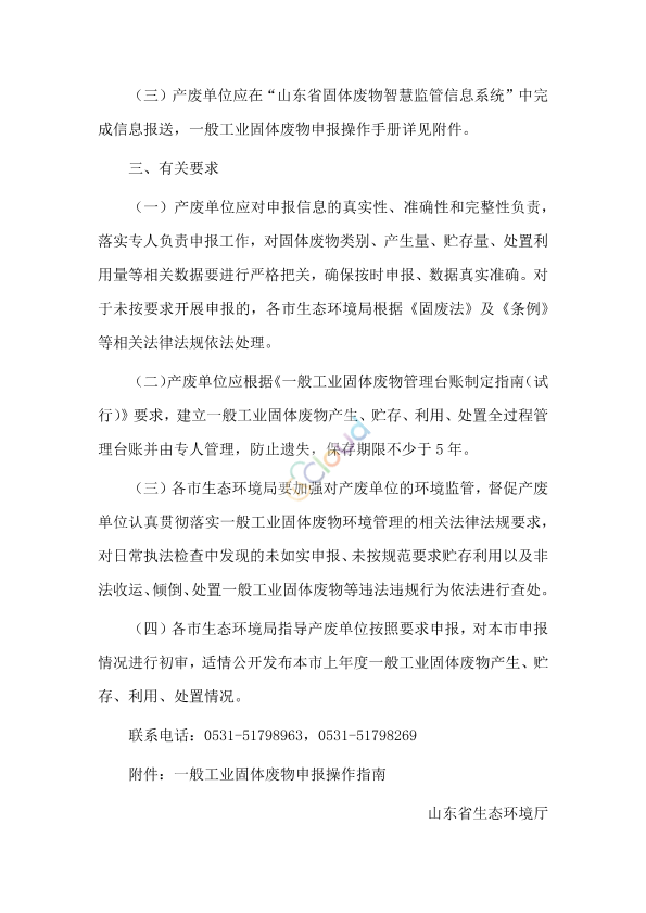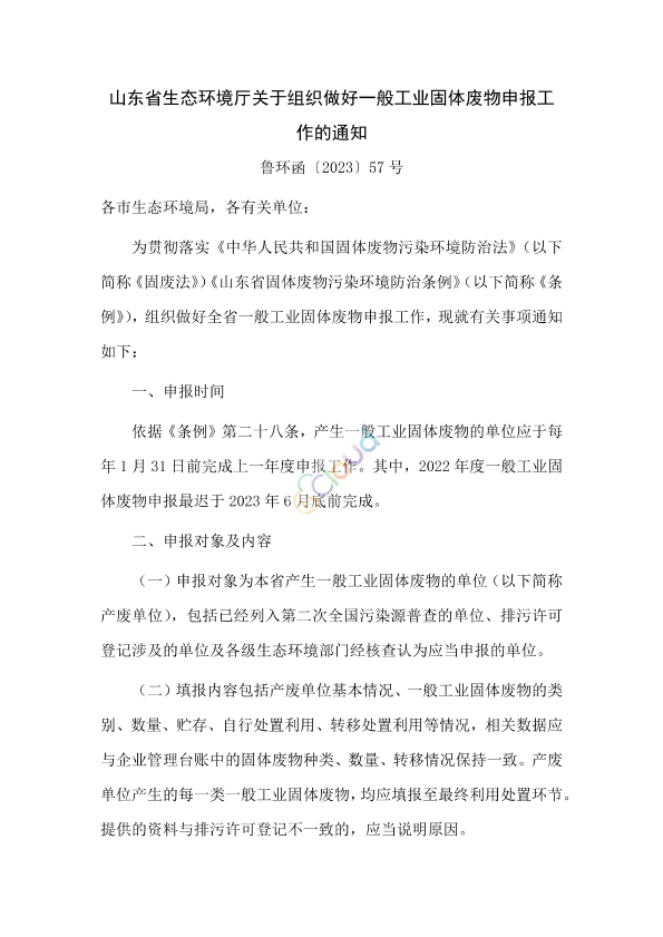 各市生态环境局,各有关单位: 为贯彻落实《中华人民共和国固体废物污染环境防治法》(以下简称《固废法》)《山东省固体废物污染环境防治条例》(以下简称《条例》),组织做好全省一般工业固体废物申报工作,现就有关事项通知如下: