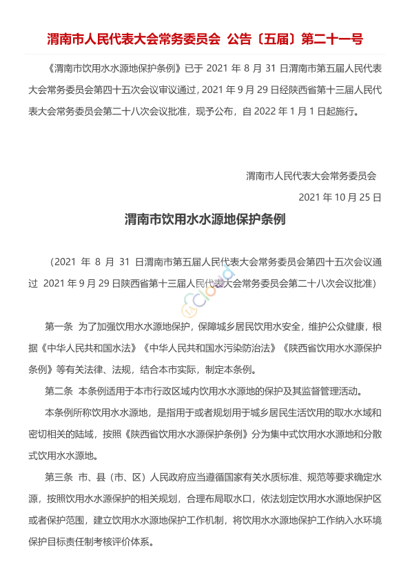 《渭南市饮用水水源地保护条例》已于2021年8月31日渭南市第五届人民代表大会常务委员会第四十五次会议审议通过,2021年9月29日经陕西省第十三届人民代表大会常务委员会第二十八次会议批准,现予公布,自2022年1月1日起施行。 渭南市人民代表大会常务委员会 2021年10月25日