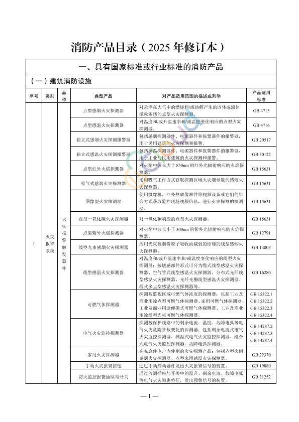 各省、自治区、直辖市消防救援总队,各森林消防总队,各训练总队,机动支队,各区域应急救援中心筹备组,各消防研究所、消防产品合格评定中心: 根据《中华人民共和国消防法》和《消防产品监督管理规定》,国家消防救援局对《消防产品目录(2022年修订本)》进行了修订。现将《消防产品目录(2025年修订本)》印发你们,望遵照执行。 国家消防救援局 2025年1月13日