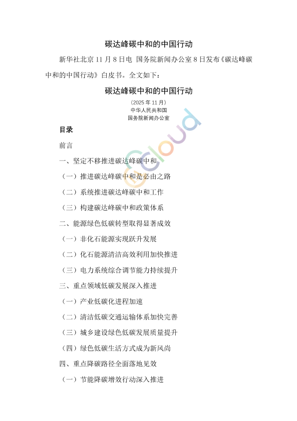 国务院新闻办公室8日发布《碳达峰碳中和的中国行动》白皮书。全文如下: 碳达峰碳中和的中国行动 (2025年11月) 中华人民共和国 国务院新闻办公室