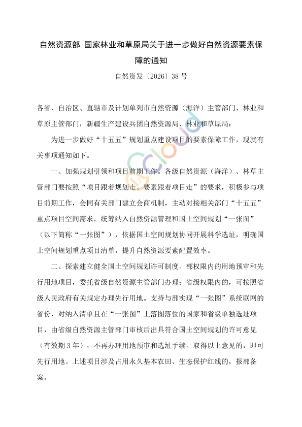 各省、自治区、直辖市及计划单列市自然资源(海洋)主管部门、林业和草原主管部门,新疆生产建设兵团自然资源局、林业和草原局: 为进一步做好“十五五”规划重点建设项目的要素保障工作,现就有关事项通知如下。