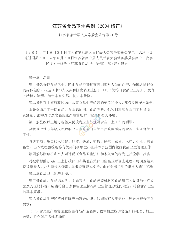 2001年10月26日江苏省第九届人民代表大会常务委员会第二十六次会议通过根据2004年8月20日江苏省第十届人民代表大会常务委员会第十一次会议《关于修改〈江苏省食品卫生条例〉的决定》修正 (2010年9月29日江苏省第十一届人民代表大会常务委员会第十七次会议通过) 《江苏省人民代表大会常务委员会关于废止〈江苏省食品卫生条例〉的决定》已由江苏省第十一届人民代表大会常务委员会第十七次会议于2010年9月29日通过,现予公布,自公布之日起施行。 江苏省人民代表大会常务委员会 2010年9月29日