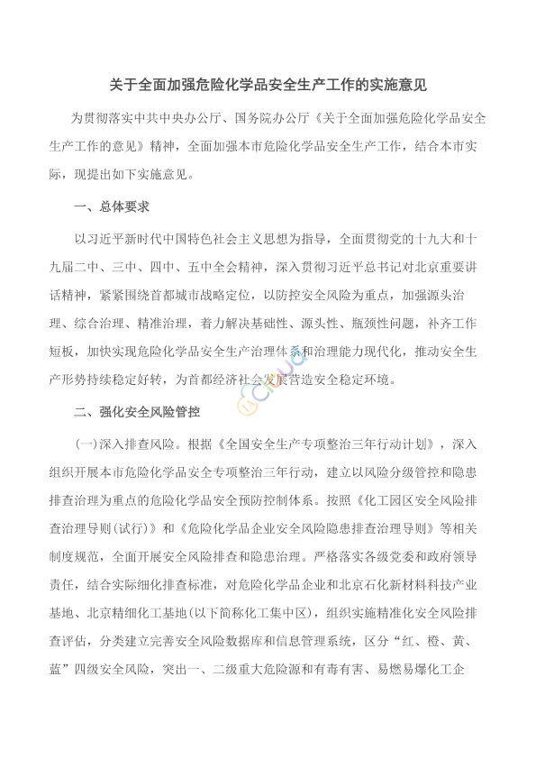 各区委、区政府,市委各部委办,市各国家机关,各国有企业,各人民团体,各高等院校: 经市委、市政府同意,现将《关于全面加强危险化学品安全生产工作的实施意见》印发给你们,请结合实际认真贯彻落实。 中共北京市委办公厅 北京市人民政府办公厅 2020年12月2日