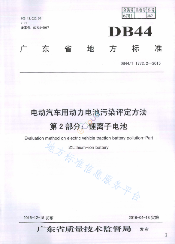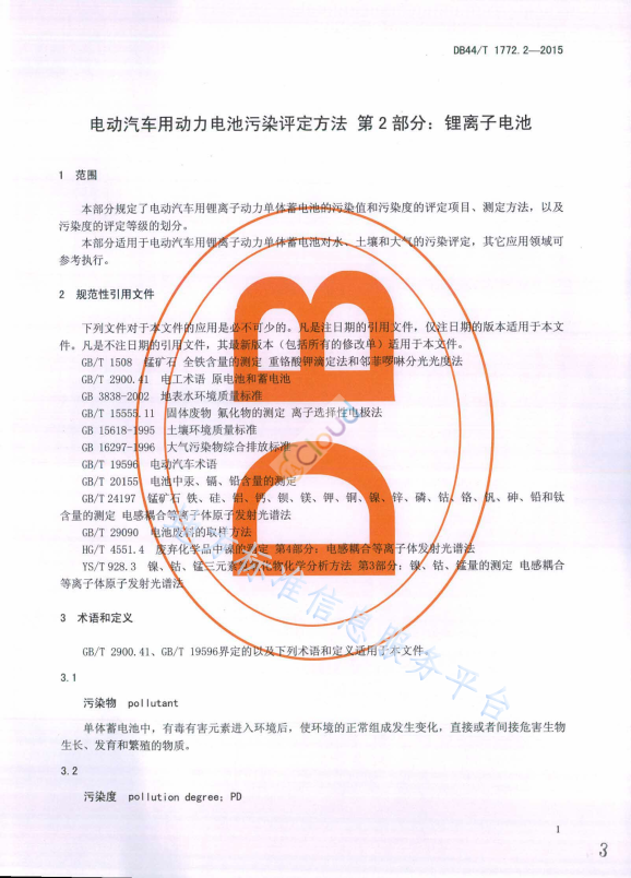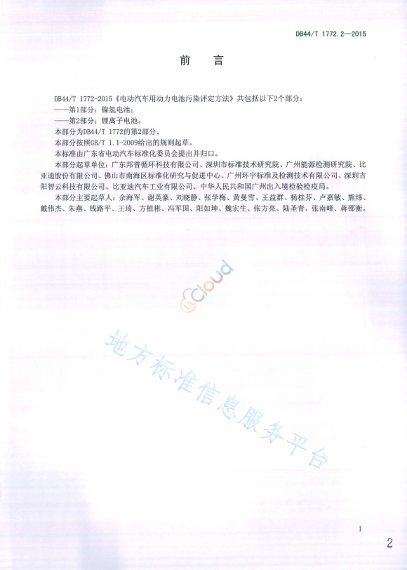 DB44/T 1772- 2015《电动汽车用动力电池污染评定方法》共包括以下2个部分: -第1部分: 镍氢电池: . -第2部分:锂离子电池。 本部分为DB44/T 1772的第2部分。 本部分按照GB/T 1. 1-2009给出的规则起草。 本标准由广东省电动汽车标准化委员会提出并归口。 本部分起草单位:广东邦普循环科技有限公司、深圳市标准技术研究院、广州能源检测研究院、比亚迪股份有限公司、佛山市南海区标准化研究与促进中心、广州环宇标准及检测技术有限公司、深圳吉阳智云科技有限公司、比亚迪汽车工业有限公司、中华人民共和国广州出入境检验检疫局。 本部分主要起草人:余海军、谢英豪、刘晓静、张学梅、黄曼雪、王益群、杨桂芬、卢嘉敏、熊炜、戴伟杰、朱燕、钱路平、王琦、方植彬、冯军国、阳如坤、魏宏生、张方亮、陆圣青、张南峰、蒋邵衡。