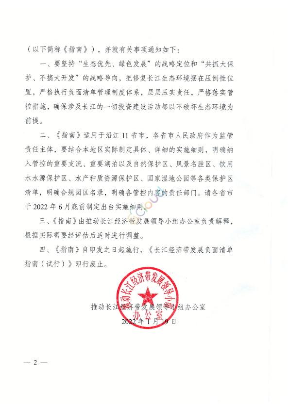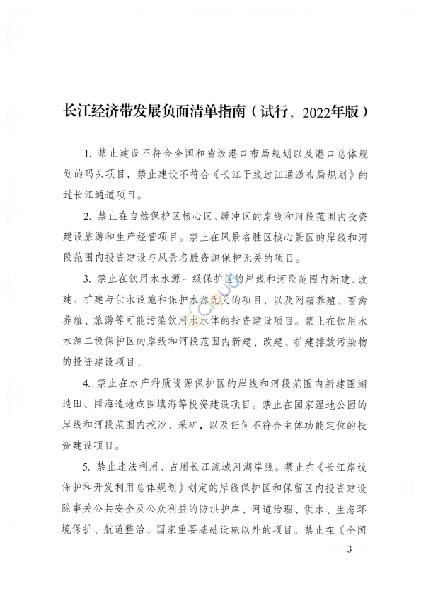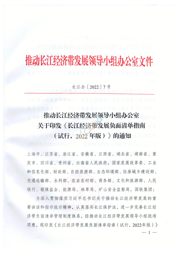 上海市、江苏省、浙江省、安徽省、江西省、湖北省、湖南省、重庆市、四川省、贵州省、云南省人民政府,国家发展改革委、工业和信息化部、财政部、自然资源部、生态环境部、住房城乡建设部、交通运输部、水利部、农业农村部、商务部、文化和旅游部、人民银行、银保监会、能源局、林草局、矿山安全监察局,国铁集团: 为深入贯彻落实习近平总书记关于推动长江经济带发展的重要讲话和指示批示精神,认真落实长江保护法,进一步完善长江经济带负面清单管理制度体系,经推动长江经济带发展领导小组批准同意,现印发《长江经济带发展负面清单指南(试行,2022年版)》(以下简称《指南》),并就有关事项通知如下: