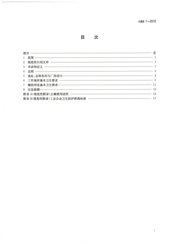 本标准规定了工业企业选址与总体布局、工作场所、辅助用室以及应急救援的基本卫生学要求。 本标准适用于工业企业新建、改建、扩建和技术改造、技术引进项目(以下统称建设项目)的卫生设计及职业病危害评价。 事业单位和其他经济组织建设项目的卫生设计及职业病危害评价、建设项目施工期持续数年或施工规模较大、因各种特殊原因需要的临时性工业企业设计,以及工业园区的总体布局等可参照本标准执行。