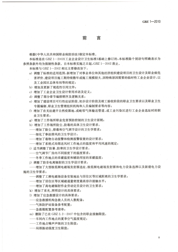 根据《中华人民共和国职业病防治法》制定本标准。 本标准是在GBZ1-2002《工业企业设计卫生标准》基础上修订的,本标准除个别语句明确表示为参照条款外均为强制性条款。自本标准实施之日,GBZ1—2002废止。 本标准与GBZ1— 2002 相比主要修改如下: a)调整了标准的适用范围,新增加了对事业单位和其他经济组织建设项目的卫生设计及职业病危害评价、建设项目施工期持续数年或施工规模较大、因特殊原因需要的临时性工业企业设计,以及工业园区总体布局等的规定; b)增加及更新了规范性引用文件; c)增加了工业企业卫生设计常用术语及定义; d)调整了部分章节编排顺序及逻辑关系; e) 增加了建设项目可行性论证阶段、初步设计阶段及竣工验收阶段的职业卫生要求以及职业卫生专篇编制、职业卫生管理组织机构和人员编制要求等内容; f)增加了在无法避开自然疫源地,或毗邻气体输送管道,或工业污染区进行工业企业选址时的职业卫生要求; g)增加了工作场所职业危害预防控制的卫生设计原则; h) 增加了工作场所防尘、防毒的具体卫生设计要求: ——增加了除尘、排毒和空气调节设计的卫生学要求; ——细化了事故排风的卫生学设计; ——增加了毒物自动报警和检测报警装置的设计要求; ——增加了系统式局部送风时工作地点的温度和平均风速的规定; i)适当调整了防暑、防寒的卫生学设计要求: ——空气调节厂房内不同湿度下的温度要求; ——冬季工作地点的采暖温度和辅助用室的采暖温度; j)调整了防非电离辐射的卫生学设计要求: ——增加了大型极低频电磁场发射源选址、极低频电磁场发射源和电力设备选择以及新建电力设 施的卫生学要求; ——调整了工频电磁场设备安装地址与居住区等区域距离的卫生学要求; ——增加了居住区等区域磁通量密度最高容许接触水平; ——增加了高电磁辐射作业劳动定员设计的卫生要求; k)增加了采光、照明设计的具体要求; l)增加了应急救援设计的具体要求; ——应急救援机构急救人员的人数配备; ——气体防护站装备参考配置; ——急救箱配置参考清单; m)删除了已在GBZ2.2一2007中包含的职业接触限值: ——车间内工作地点的夏季空气温度规定; ——工作地点噪声声级的卫生限值; ——局部振动强度卫生限值; ——工作地点微波辐射强度卫生限值; ——高频辐射强度卫生限值; ——工频高压电作业场所的电场强度限值; ——工作地点脉冲噪声声级的卫生限值; ·——劳动强度分级; n)删除了原GBZ1— ⒛02的规范性附录-附录B:体力劳动强度分级方法; o)增加了工业企业卫生防护距离标准,见规范性附录-附录B; p)特殊行业如制药、生物、食品加工等行业在遵守本标准基础上,还应根据行业特点制定符合本标准的配套标准; 本标准的附录A、B为规范性附录。 本标准由卫生部职业卫生标准专业委员会提出。 本标准由中华人民共和国卫生部批准。 本标准主要起草单位:中国疾病预防控制中心职业卫生与中毒控制所、中国疾病预防控制中心环境与健康相关产品安全所、复旦大学公共卫生学院、北京大学公共卫生学院、首都经济贸易大学、北京市疾病预防控制中心、上海市疾病预防控制中心、辽宁省疾病预防控制中心、中华全国总工会、山东省职业卫生与职业病防治研究院、河南省职业病防治研究所、辽宁省职业病防治院、鞍山钢铁集团公司劳动卫生研究所、中国纺织勘察设计协会、中国化学工业协会、中国石油和化工勘察设计协会、全国电力行业劳动环境检测监督总站。 本标准主要起草人:李涛、张敏、吴维皑、杜燮祜、邵强、徐伯洪、梁友信、戴自祝、王生、郭建中、王忠旭、李文捷、赵容、吕琳、吴世达、刘茁、余善法、李刚、刘晓延、邵华、林菡、王恩业、刘承彬、樊晶光、赵桂芹、王丹、金晔鑫、陈青松、张永。 本标准所代替标准的历次版本发布情况为: — —标准-101-56,GBJ1-62,TJ36-79,GBZ-2002 。