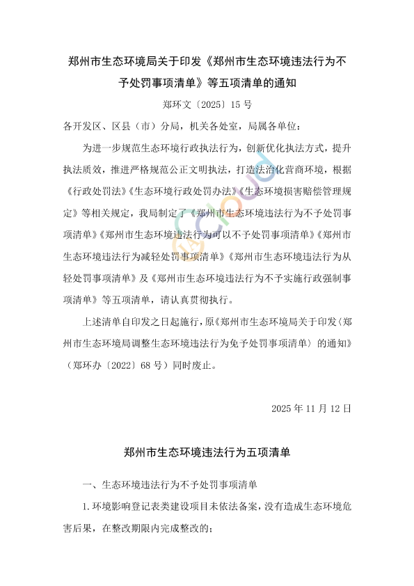 各开发区、区县(市)分局,机关各处室,局属各单位: 为进一步规范生态环境行政执法行为,创新优化执法方式,提升执法质效,推进严格规范公正文明执法,打造法治化营商环境,根据《行政处罚法》《生态环境行政处罚办法》《生态环境损害赔偿管理规定》等相关规定,我局制定了《郑州市生态环境违法行为不予处罚事项清单》《郑州市生态环境违法行为可以不予处罚事项清单》《郑州市生态环境违法行为减轻处罚事项清单》《郑州市生态环境违法行为从轻处罚事项清单》及《郑州市生态环境违法行为不予实施行政强制事项清单》等五项清单,请认真贯彻执行。 上述清单自印发之日起施行,原《郑州市生态环境局关于印发〈郑州市生态环境局调整生态环境违法行为免予处罚事项清单〉的通知》(郑环办〔2022〕68号)同时废止。 2025年11月12日
