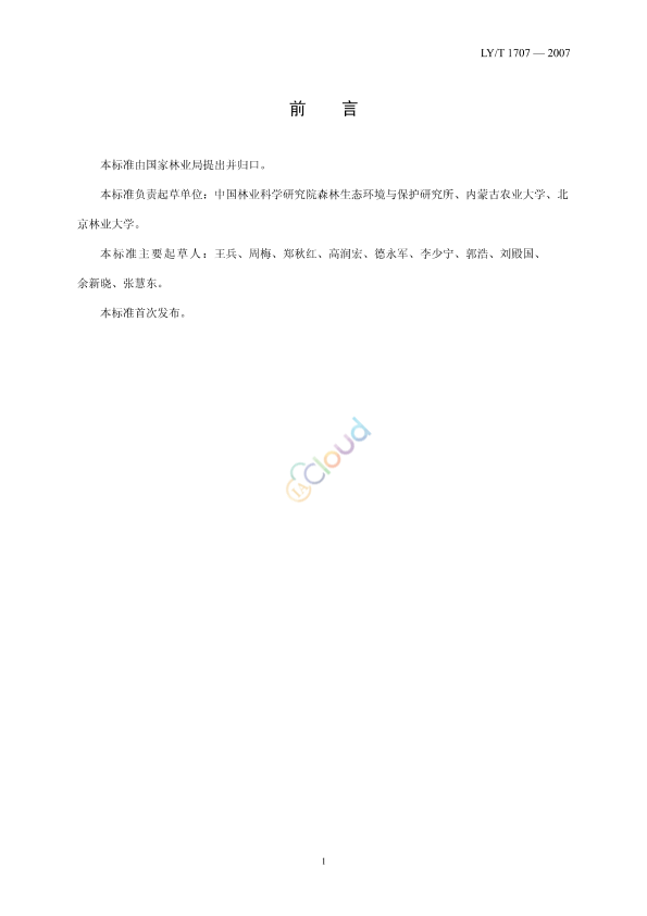 本标准由国家林业局提出并归口。 本标准负责起草单位:中国林业科学研究院森林生态环境与保护研究所、内蒙古农业大学、北京林业大学。 本标准主要起草人:王兵、周梅、郑秋红、高润宏、德永军、李少宁、郭浩、刘殿国、余新晓、张慧东。 本标准首次发布。