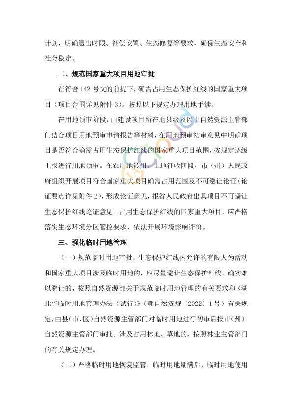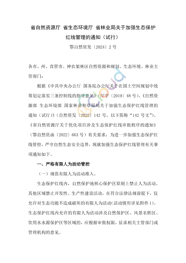 根据《中共中央办公厅国务院办公厅关于在国土空间规划中统筹划定落实三条控制线的指导意见》(厅字〔2019〕48号)、《自然资源部生态环境部国家林业和草原局关于加强生态保护红线管理的通知(试行)》(自然资发〔2022〕142号,以下简称“142号文”)、《省自然资源厅关于优化项目涉及生态保护红线审批程序的通知》(鄂自然资函〔2022〕663号)有关要求,为进一步加强生态保护红线管控,严守自然生态安全边界,现就加强生态保护红线管理有关事项通知如下。