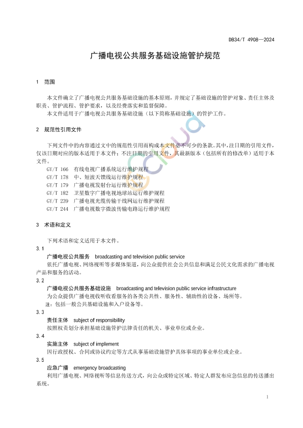 本文件确立了广播电视公共服务基础设施的基本原则,并规定了基础设施的管护对象、责任主体及职责、管护流程、管护要求,以及经费落实和监督保障。 本文件适用于广播电视公共服务基础设施(以下简称基础设施)的管护工作。