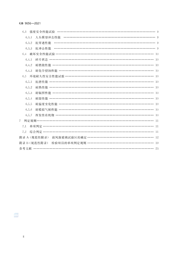 本标准按照GB/T 1.1- 2009 给出的规则起草。 本标准代替GB 9656- 2003《汽车安全玻璃》,与GB 9656- -2003 相比,除编辑性修改外主要技术变化如下: -增加了术语和定义(见第 3章); -增加了刚性塑料玻璃的内容(见3.8.4.1.5.1.1,5.3.1,5.3.3.3、5.4.2.5.4.3,5.5.1.5.5.4,5.5.6、6.3.1.6.3.3.6.5.3.附录B); -增加了 对抬头显示玻璃的要求(见3.12,5.3.1 ,5,3.3,1.6.2.1); -增加了试验方法总则(见6.1); -增加了有关厚夹层安全玻璃抗磨性能试验方法的要求(见6.5.1); -增加了有关贴膜玻璃的内容(见第2章、3.9.4.1、5.1.2,5.4.2、5.4.3,5.5.1.5.5.3,5.5.7.6.4.2、6.4.3,6.5.1,6.5.3,附录B); -修改了分类(见第4章,2003年版的第3章); -修改了前风窗的试验区分区(见附录A,2003年版的附录A); -修改了非检验区域的说明(见5.2.2,5.2.3,2003年版的5.3,5.4); -修改 了前风窗以外夹层安全玻璃抗冲击后的样品状态要求(见5.3.3.3,2003年版的5.12.2) ; -修改了耐燃烧性能的要求(见5.4.2,2003年版的5.15) 5 . -删除了主要技术要求和一般技术要求的分类(见2003年版的4.2); -删除了颜色识别要求(见2003年版的5,5,7.5); -删除了有关区域钢化安全玻璃的内容(见2003年版的3.1.3.2.1.5.1,5.2、5.3、5.4,5,5、5.10、5.13,7.13.1和8.3.1.6注); -删除了前风窗以外用夹层安全玻璃及塑玻复合材料的以试验片为试样的人头模型冲击试验(见2003年版的5.10.2); -删除了一 般性技术要求(见2003年版的第6章); -删除了检验规则(见2003年版的第8章); -删除了包装、标志,运输、贮存(见2003年版的第9章); 原标准中7.2~7.14中所有有关检验样品数量及判定的内容合并为附录B。 本标准由中华人民共和国工业和信息化部提出并归口。 本标准所代替标准的历次版本发布情况; -GB 9656-1988 ,GB 9656-1996,GB 9656-2003。