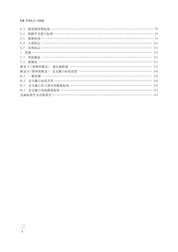 GB 5768的本部分规定了道路交通标线的分类、颜色、形状、字符、图形、尺寸等一般要求,以及设计设置的要求。 本部分适用于公路,城镇道路和虽在单位管辖范围但允许社会机动车通行的地方,包括广场、公共停车场等用于公众通行的场所等的交通标线的制作和设置。其他机动车通行的地方、停车场等设置的交通标线可参照执行。