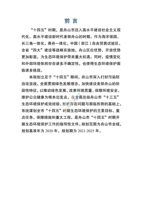 “十四五”时期,是舟山市迈入高水平建设社会主义现代化、高水平建设新时代美丽舟山的时期。作为海洋强国、长三角一体化、甬舟一体化,中国(浙江)自由贸易试验区、全省“四大”建设等战略实施地,舟山区位优势、开放优势更加彰显,为生态环境保护带来重大机遇。同时,疫情变化和外部环境依然存在诸多不确定性,也使得生态环境保护面临诸多挑战。 本规划立足于“十四五”期间,舟山市深入打好污染防治攻坚战、全面贯彻绿色发展理念、加快建设美丽舟山的阶段性特征,以推动绿色发展、改善环境质量、保障环境安全、维护公众健康为根本出发点,在全面总结舟山市“十三五”生态环境保护成效经验、剖析存在问题与面临形势的基础上,系统谋划全市“十四五”时期生态环境保护的主要目标、重点任务、保障措施和重大工程,是舟山市“十四五”时期开 展生态环境保护工作的指导性文件。规划范围为舟山市全域,规划基准年为2020 年,规划期为2021-2025 年。
