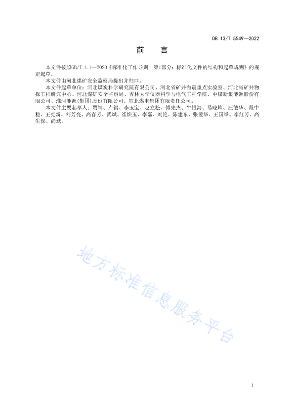 本文件按照GB/T 1.1- 2020 《标准化工作导则第1部分: 标准化文件的结构和起草规则》的规定起草。 本文件由河北煤矿安全监察局提出并归口。 本文件起草单位:河北煤炭科学研究院有限公司、河北省矿井微晨重点实验室、河北省矿井物探工程研究中心、河北煤矿安全监察局、吉林大学仪器科学与电气工程学院、中煤新集能源股份有限公司、淮河能源(集团)股份有限公司、皖北煤电集团有限责任公司。 本文件主要起草人:贾靖、卢钢、李玉宝、赵立松、傅先杰、牛银海、易晓峰、汪敏华、段中稳、王克新、刘芳亮、高春芳、武斌、崔焕玉、李嘉、刘艳、陈建东、张爱华、王国举、李红芳、高生保、尚斌。