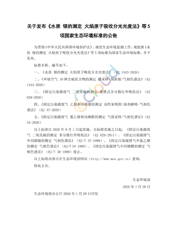 为贯彻《中华人民共和国环境保护法》,规范生态环境监测工作,现批准《水质 银的测定 火焰原子吸收分光光度法》等5项标准为国家生态环境标准,并予发布。