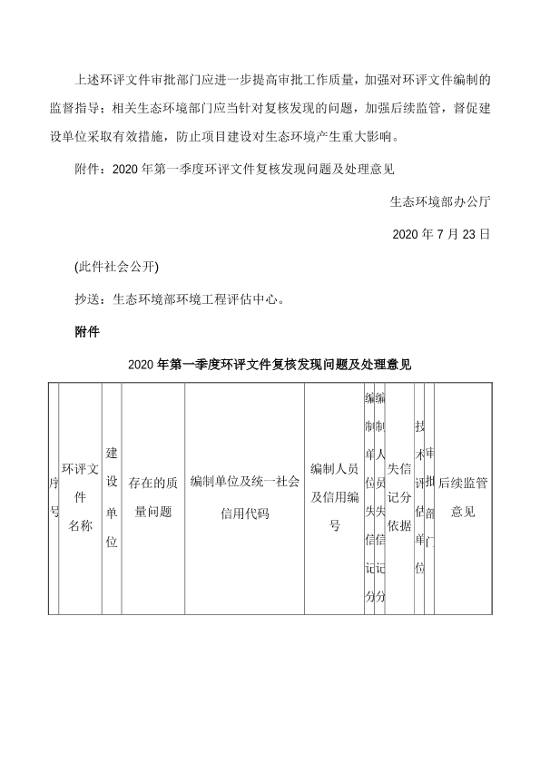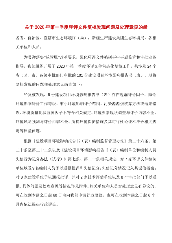 各省、自治区、直辖市生态环境厅(局),新疆生产建设兵团生态环境局,各相关单位和人员: 为贯彻落实“放管服”改革要求,强化环评文件编制事中事后监管和审批业务指导,我部组织开展了2020年第一季度环评文件常态化复核工作,共涉及24个省(区、市)各级审批部门审批的101份建设项目环境影响报告书(表)。现将复核发现的问题和处理意见函告如下: