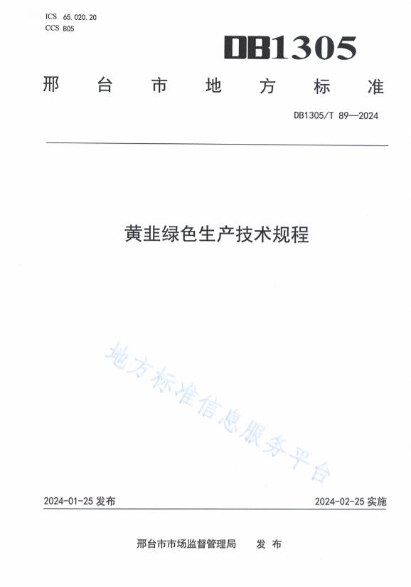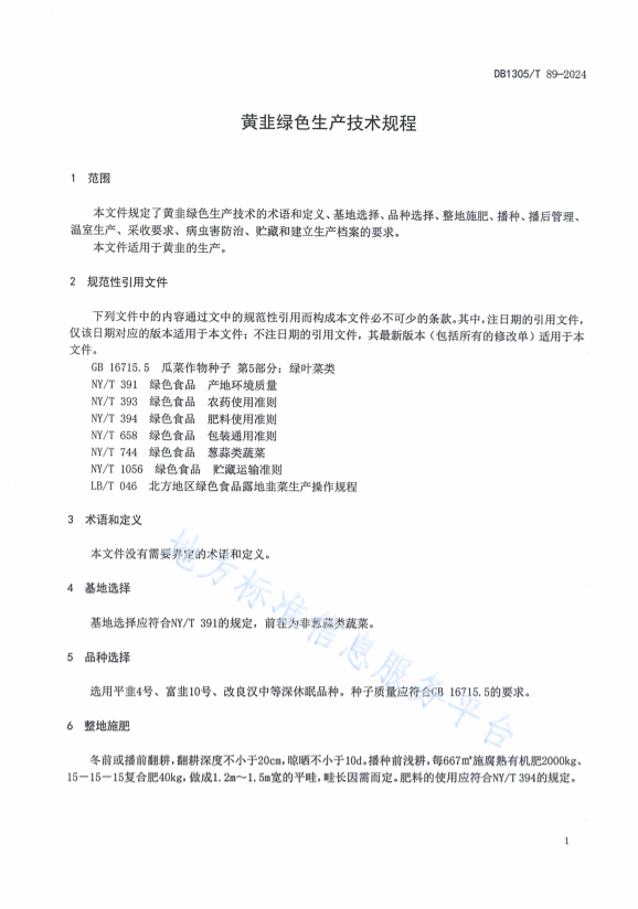 本文件规定了黄韭绿色生产技术的术语和定义、基地选择、品种选择、整地施肥、播种、播后管理、温室生产、采收要求、病虫害防治、贮藏和建立生产档案的要求。 本文件适用于黄韭的生产。