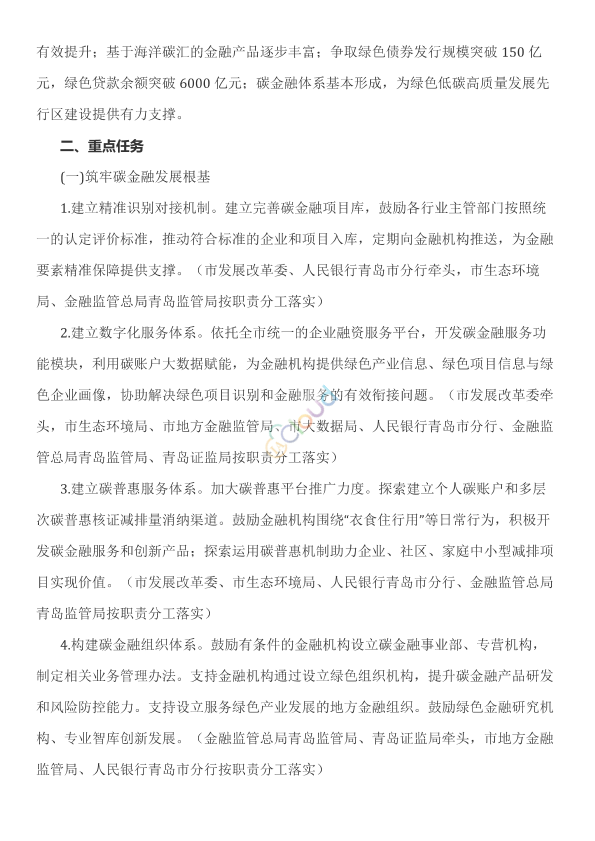 《青岛市人民政府办公厅关于印发青岛市碳金融发展三年行动方案(2023•2025年)的通知》是一份关于青岛市碳金融发展的政策文件。该文件旨在贯彻落实国家和省级关于碳达峰和碳中和的决策部署,推动绿色低碳高质量发展,构建支持经济社会全面绿色低碳转型的金融服务体系。以下是对该文件内容的分析: