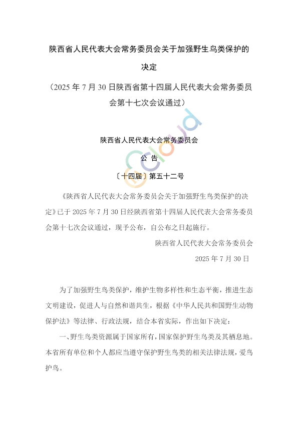 陕西省人大常委会关于加强野生鸟类保护的决定(2025年7月)