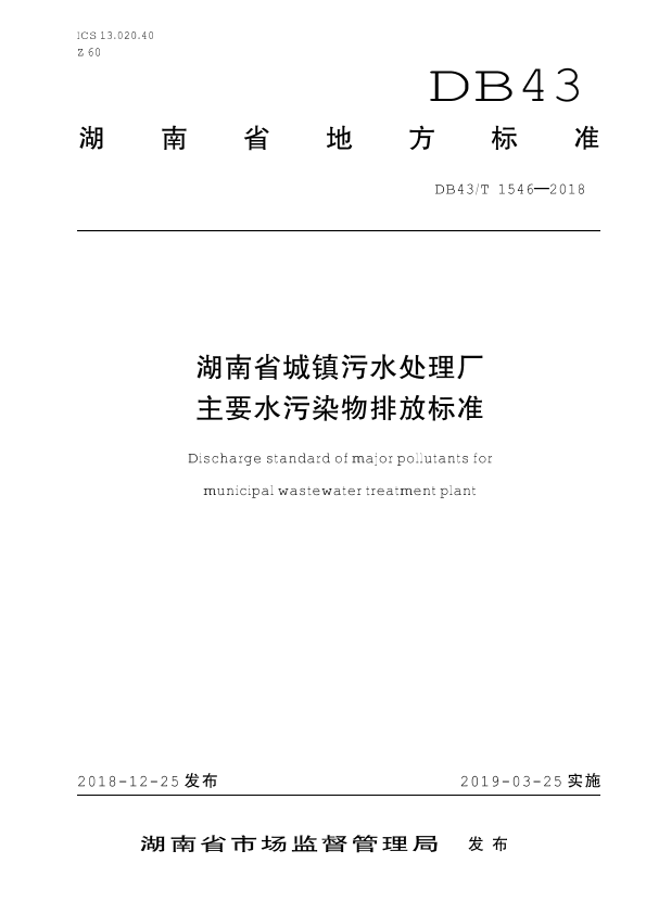 本标准规定了湖南省范围内的城镇污水处理厂化学需氧量、氨氮、总氮和总磷的排放限值及监测要求。 本标准适用于湖南省县级及以上城镇污水处理厂。 本标准中未列出的项目执行 GB 18918 的相应要求。
