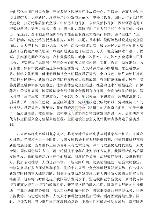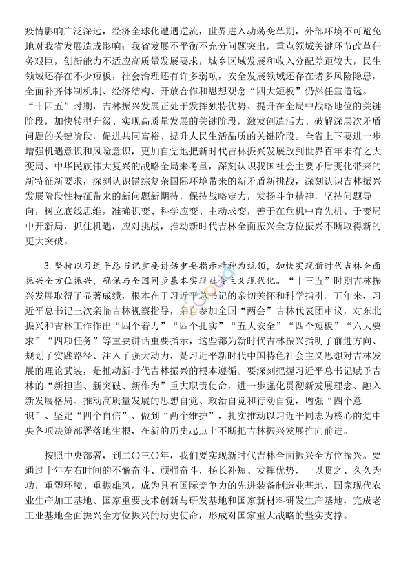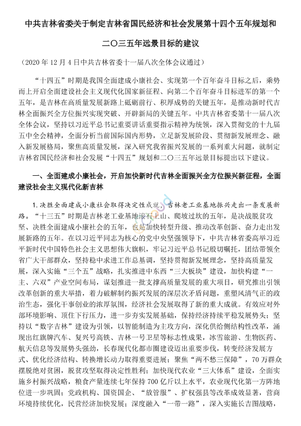 (2020年12月4日中共吉林省委十一届八次全体会议通过) “十四五”时期是我国全面建成小康社会、实现第一个百年奋斗目标之后,乘势而上开启全面建设社会主义现代化国家新征程、向第二个百年奋斗目标进军的第一个五年,是吉林在高质量发展新路上砥砺前行、积厚成势的关键五年,是推动新时代吉林全面振兴全方位振兴实现突破、开辟新局的关键五年。中共吉林省委第十一届八次全体会议,坚持以习近平总书记重要讲话重要指示精神为统领,深入贯彻党的十九届五中全会精神,全面分析当前国际国内形势,立足新发展阶段、贯彻新发展理念、融入新发展格局,聚焦高质量发展,深入研究我省振兴发展的一系列重大问题,就制定吉林省国民经济和社会发展“十四五”规划和二〇三五年远景目标提出以下建议。