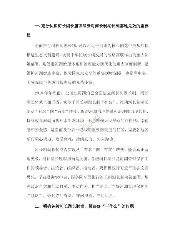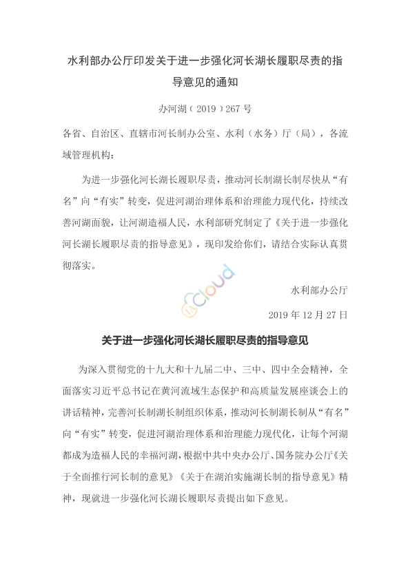 各省、自治区、直辖市河长制办公室、水利(水务)厅(局),各流域管理机构: 为进一步强化河长湖长履职尽责,推动河长制湖长制尽快从“有名”向“有实”转变,促进河湖治理体系和治理能力现代化,持续改善河湖面貌,让河湖造福人民,水利部研究制定了《关于进一步强化河长湖长履职尽责的指导意见》,现印发给你们,请结合实际认真贯彻落实。 水利部办公厅 2019年12月27日