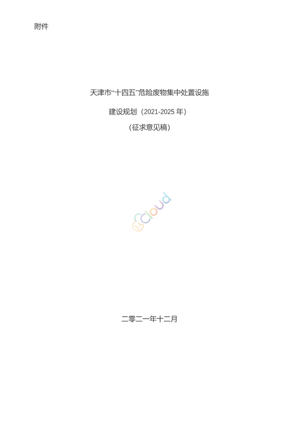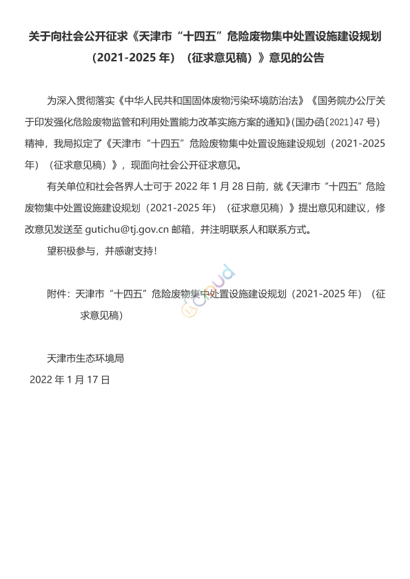 为深入贯彻落实《中华人民共和国固体废物污染环境防治法》《国务院办公厅关于印发强化危险废物监管和利用处置能力改革实施方案的通知》(国办函〔2021〕47号)精神,我局拟定了《天津市“十四五”危险废物集中处置设施建设规划(2021-2025年)(征求意见稿)》,现面向社会公开征求意见。 有关单位和社会各界人士可于2022年1月28日前,就《天津市“十四五”危险废物集中处置设施建设规划(2021-2025年)(征求意见稿)》提出意见和建议,修改意见发送至gutichu@tj.gov.cn邮箱,并注明联系人和联系方式。 望积极参与,并感谢支持! 附件:天津市“十四五”危险废物集中处置设施建设规划(2021-2025年)(征求意见稿) 天津市生态环境局 2022年1月17日