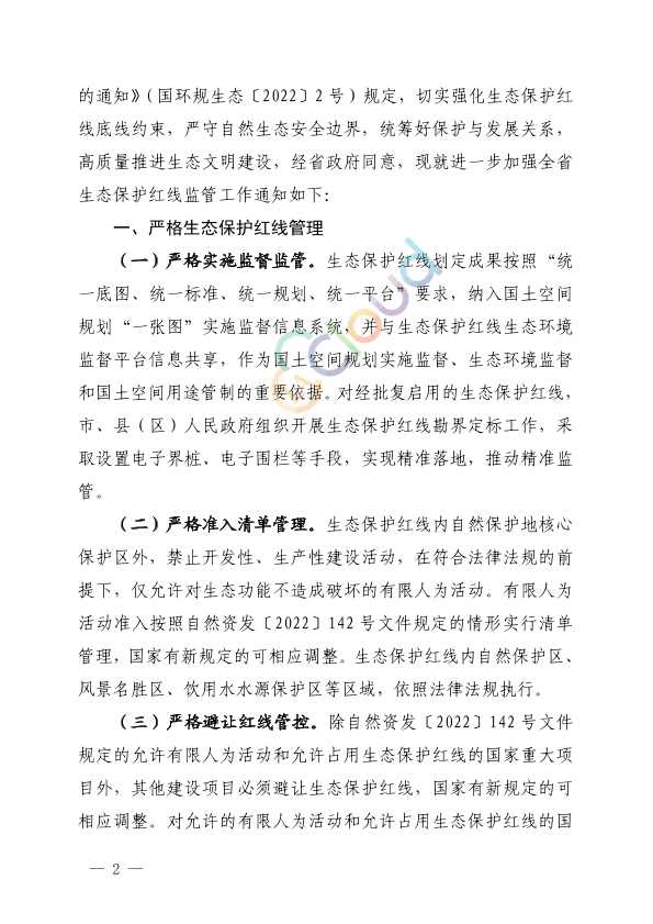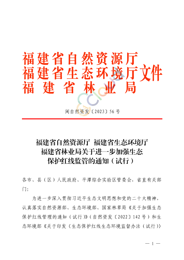 各市、县(区)人民政府、平潭综合实验区管委会,省直有关部门:为进一步深入贯彻习近平生态文明思想和党的二十大精神,认真落实自然资源部、生态环境部、国家林草局《关于加强生态保护红线管理的通知(试行)》(自然资发〔2022〕142号)和生态环境部《关于印发〈生态保护红线生态环境监督办法(试行)〉的通知》(国环规生态〔2022〕2号)规定,切实强化生态保护红线底线约束,严守自然生态安全边界,统筹好保护与发展关系,高质量推进生态文明建设,经省政府同意,现就进一步加强全省生态保护红线监管工作通知如下: