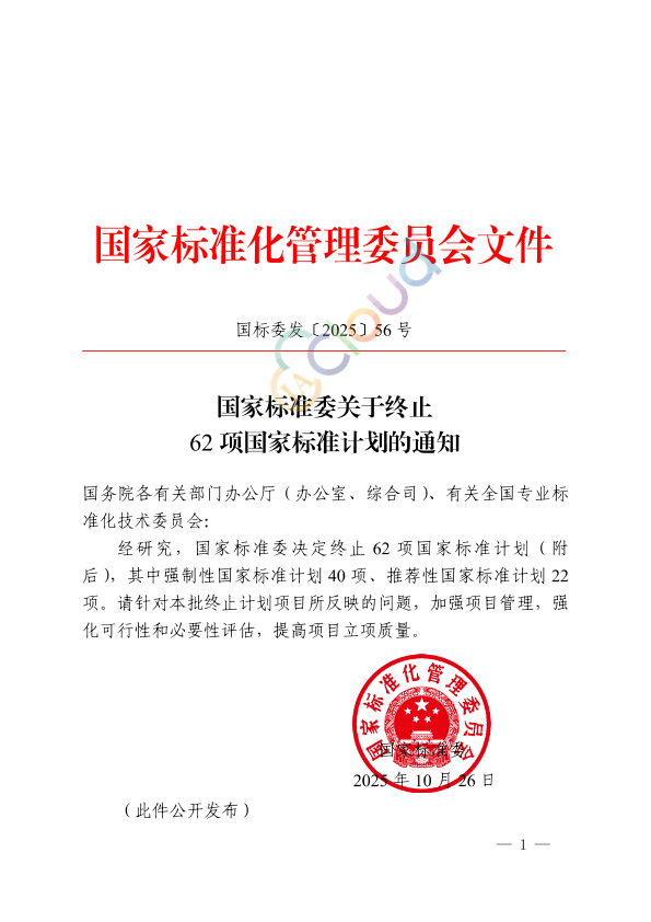 国务院各有关部门办公厅(办公室、综合司)、有关全国专业标准化技术委员会: 经研究,国家标准委决定终止62项国家标准计划(附后),其中强制性国家标准计划40项、推荐性国家标准计划22项。请针对本批终止计划项目所反映的问题,加强项目管理,强化可行性和必要性评估,提高项目立项质量。 国家标准委 2025年10月26日