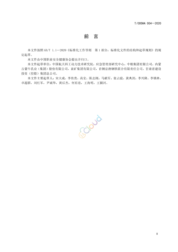 本文件按照GB/T 1.1- -2020《标准化工作导则第1 部分:标准化文件的结构和起草规则》的规定起草. 本文件由中国职业安全健康协会提出并归口。 本文件起草单位:中国航天科工动力技术研究院,应急管理部研究中心,中粮集团有限公司,内蒙古蒙牛乳业(集团)股份有限公司,衮矿集团有限公司,首钢京唐钢铁联合有限责任公司,甘肃省建设投资(控股)集团总公司。 本文件主要起草人:宋大成,李传贵,高宏,陈志刚,马献军,张占庭,黄典剑,李兴隆,李锁林,卓超群,刘红军,尹斌华,黄后杰,何有忠,王海明,王颍河。