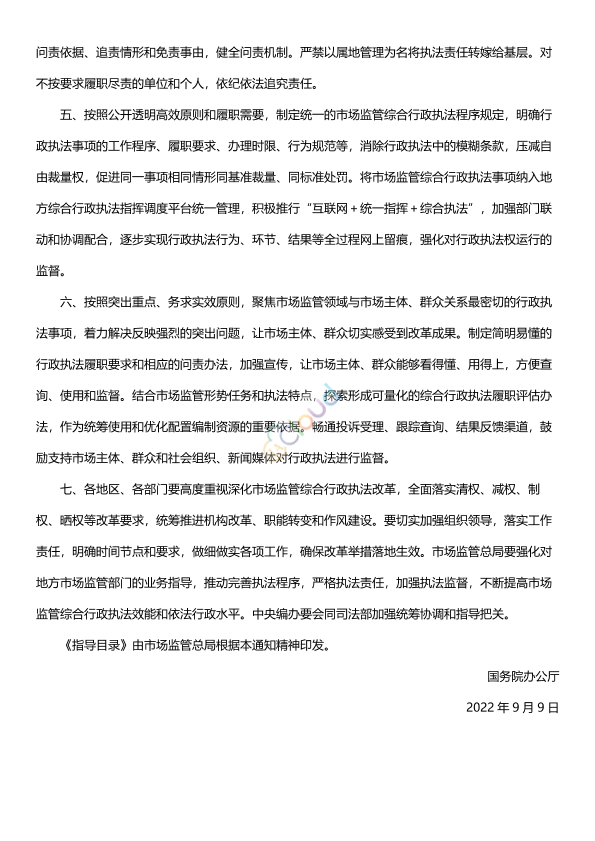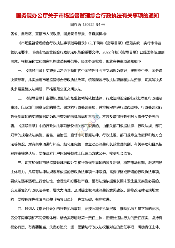 各省、自治区、直辖市人民政府,国务院各部委、各直属机构: 《市场监督管理综合行政执法事项指导目录》(以下简称《指导目录》)是落实统一实行市场监管执法要求、明确市场监管综合行政执法职能的重要文件,2022年版《指导目录》已经国务院原则同意。根据深化党和国家机构改革有关部署,经国务院批准,现就有关事项通知如下:
