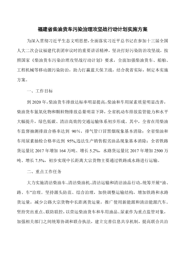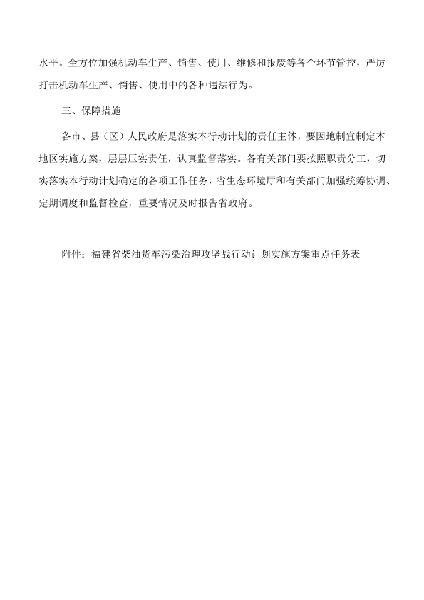 各设区市人民政府,平潭综合实验区管委会,省直各有关单位: 经省政府同意,现将《福建省柴油货车污染治理攻坚战行动计划实施方案》印发给你们,请认真贯彻执行。 福建省生态环境厅 福建省发展和改革委员会 福建省工业和信息化厅 福建省交通运输厅 福建省公安厅 福建省财政厅 福建省商务厅 福建省市场监督管理局 2019年5月18日