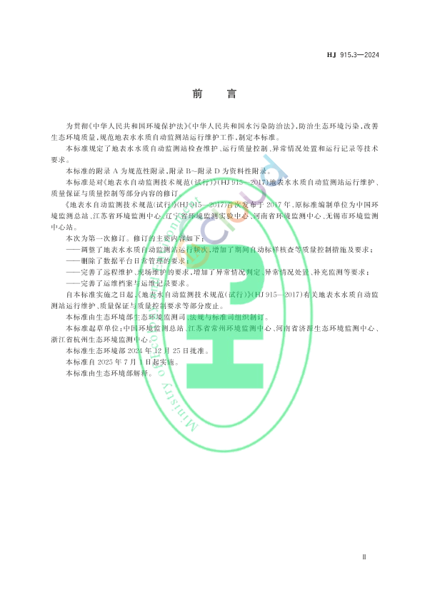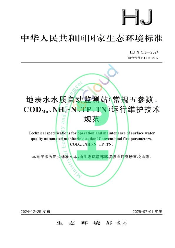 为贯彻《中华人民共和国环境保护法》《中华人民共和国水污染防治法》,防治生态环境污染,改善生态环境质量,规范地表水水质自动监测站运行维护工作,制定本标准。 本标准规定了地表水水质自动监测站检查维护、运行质量控制、异常情况处置和运行记录等技术要求。 本标准的附录 A 为规范性附录,附录 B~附录 D 为资料性附录。 本标准是对《地表水自动监测技术规范(试行)》(HJ 915—2017)地表水水质自动监测站运行维护、质量保证与质量控制等部分内容的修订。 《地表水自动监测技术规范(试行)》(HJ 915—2017)首次发布于 2017 年,原标准编制单位为中国环境监测总站、江苏省环境监测中心、辽宁省环境监测实验中心、河南省环境监测中心、无锡市环境监测中心站。 本次为第一次修订。修订的主要内容如下: ——调整了地表水水质自动监测站运行频次,增加了期间自动标样核查等质量控制措施及要求; ——删除了数据平台日常管理的要求; ——完善了远程维护、现场维护的要求,增加了异常情况判定、异常情况处置、补充监测等要求; ——完善了运维档案与运维记录要求。 自本标准实施之日起,《地表水自动监测技术规范(试行)》(HJ 915—2017)有关地表水水质自动监测站运行维护、质量保证与质量控制要求等部分废止。 本标准由生态环境部生态环境监测司、法规与标准司组织制订。 本标准起草单位:中国环境监测总站、江苏省常州环境监测中心、河南省济源生态环境监测中心、浙江省杭州生态环境监测中心。 本标准生态环境部 2024 年 12 月 25 日批准。 本标准自 2025 年 7 月 1 日起实施。 本标准由生态环境部解释。