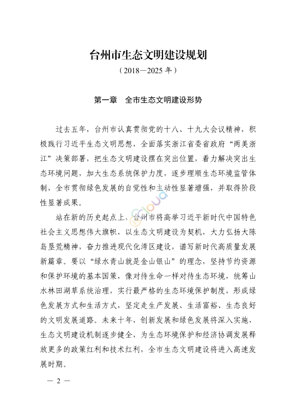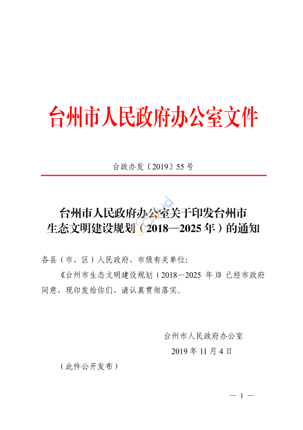 各县(市、区)人民政府,市级有关单位: 《台州市生态文明建设规划(2018—2025年)》已经市政府同意,现印发给你们,请认真贯彻落实。 台州市人民政府办公室 2019年11月4日