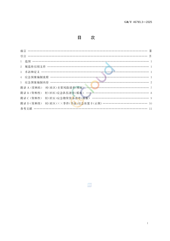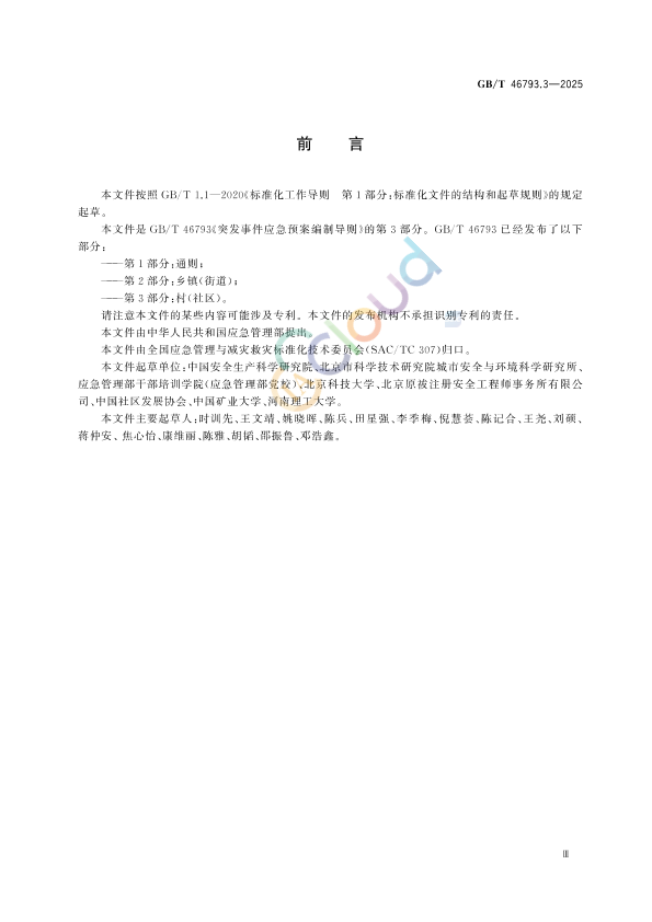 本文件按照GB/T1.1—2020《标准化工作导则 第1部分:标准化文件的结构和起草规则》的规定起草。 本 文件是GB/T46793《突发事件应急预案编制导则》的第3部分。GB/T46793已经发布了以下部分: ———第1部分:通则; ———第2部分:乡镇(街道); ———第3部分:村(社区)。 请注意本文件的某些内容可能涉及专利。本文件的发布机构不承担识别专利的责任。 本文件由中华人民共和国应急管理部提出。 本文件由全国应急管理与减灾救灾标准化技术委员会(SAC/TC307)归口。 本文件起草单位:中国安全生产科学研究院、北京市科学技术研究院城市安全与环境科学研究所、应急管理部干部培训学院(应急管理部党校)、北京科技大学、北京原祓注册安全工程师事务所有限公 司、中国社区发展协会、中国矿业大学、河南理工大学。 本文件主要起草人:时训先、王文靖、姚晓晖、陈兵、田星强、李季梅、倪慧荟、陈记合、王尧、刘硕、蒋仲安、焦心怡、康维丽、陈雅、胡韬、邵振鲁、邓浩鑫。
