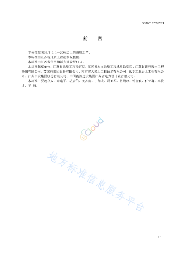 本标准按照GB/T 1.1—2009给出的规则起草。 本标准由江苏省地质工程勘察院提出。 本标准由江苏省住房和城乡建设厅归口。 本标准起草单位:江苏省地质工程勘察院、江苏省水文地质工程地质勘察院、江苏省建苑岩土工程勘测有限公司、苏交科集团股份有限公司、南京南大岩土工程技术有限公司、化学工业岩土工程有限公司、江苏中设集团股份有限公司、中国能源建设集团江苏省电力设计院有限公司。 本标准主要起草人:章建平、胡唐伯、尤苏南、丁加宏、周亚军、张道政、钟金良、任亚群、李俊才、王 琦。