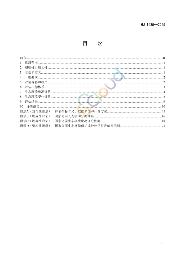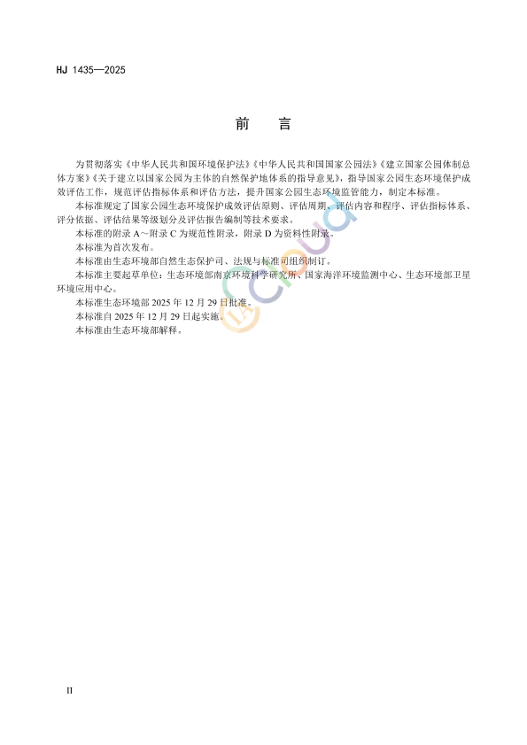 为贯彻落实《中华人民共和国环境保护法》《中华人民共和国国家公园法》《建立国家公园体制总体方案》《关于建立以国家公园为主体的自然保护地体系的指导意见》,指导国家公园生态环境保护成效评估工作,规范评估指标体系和评估方法,提升国家公园生态环境监管能力,制定本标准。 本标准规定了国家公园生态环境保护成效评估原则、评估周期、评估内容和程序、评估指标体系、评分依据、评估结果等级划分及评估报告编制等技术要求。 本标准的附录 A~附录 C 为规范性附录,附录 D 为资料性附录。 本标准为首次发布。 本标准由生态环境部自然生态保护司、法规与标准司组织制订。 本标准主要起草单位:生态环境部南京环境科学研究所、国家海洋环境监测中心、生态环境部卫星环境应用中心。 本标准生态环境部 2025 年 12 月 29 日批准。 本标准自 2025 年 12 月 29 日起实施。 本标准由生态环境部解释。