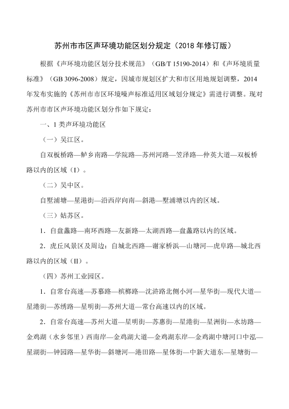 各区人民政府,苏州工业园区、苏州高新区管委会;市各委办局,各直属单位: 《苏州市市区声环境功能区划分规定》(2018年修订版)已经市政府第58次常务会议审议通过,现印发给你们,请认真贯彻执行。 苏州市人民政府 2019年3月8日